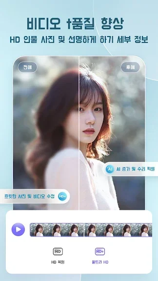 - AI 향상: 오래된 흐린 사진과 동영상에 활력을 불어넣고, 첨단 AI 기술을 통해 이미지와 동영상 해상도를 높일 수 있습니다.