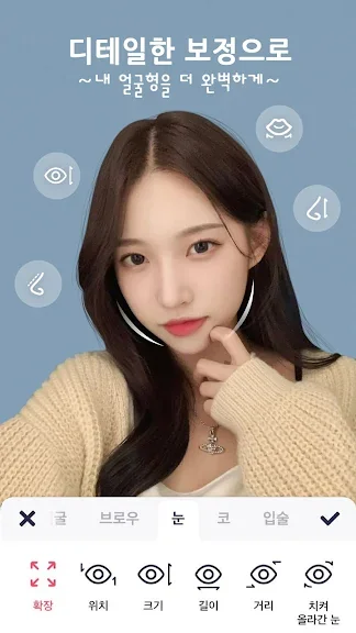 손가락으로 슥슥 움직여 손쉽게 성형하기! 터치 부위를 움직여 쉽게 성형하거나 터치부위만 크게/작게 할 수 있어요! 위의 두가지 성형 메뉴가 마음에 들지 않으면 터치에디터로 구석구석 편집해 보세요.