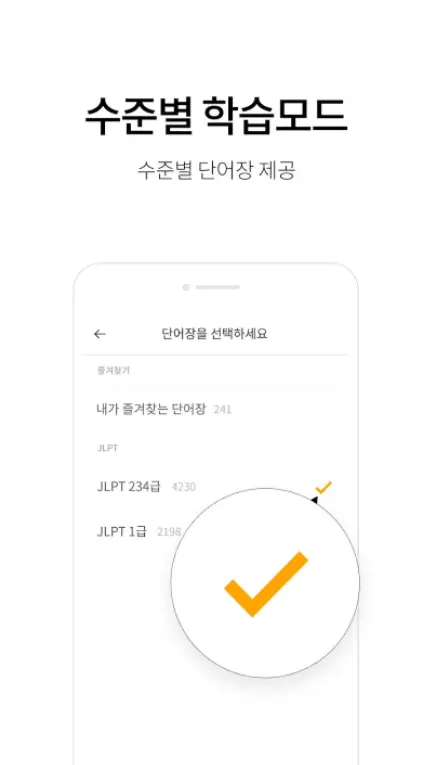 자신이 배우기를 원하는 단어장 선택은 물론, 학습하고 있는 단어장의 단어 리스트도 제공하여 일본어 사전으로도 활용할 수 있습니다.