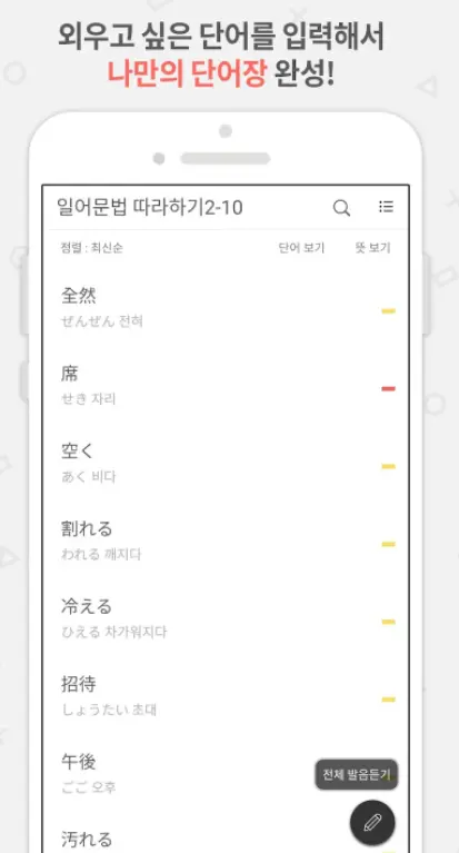 일본어 단어장 앱은 내가 외우고 싶은 일본어 단어 만을 모아 단어장으로 만들어 학습할 수 있는 무료 단어장 앱 입니다.