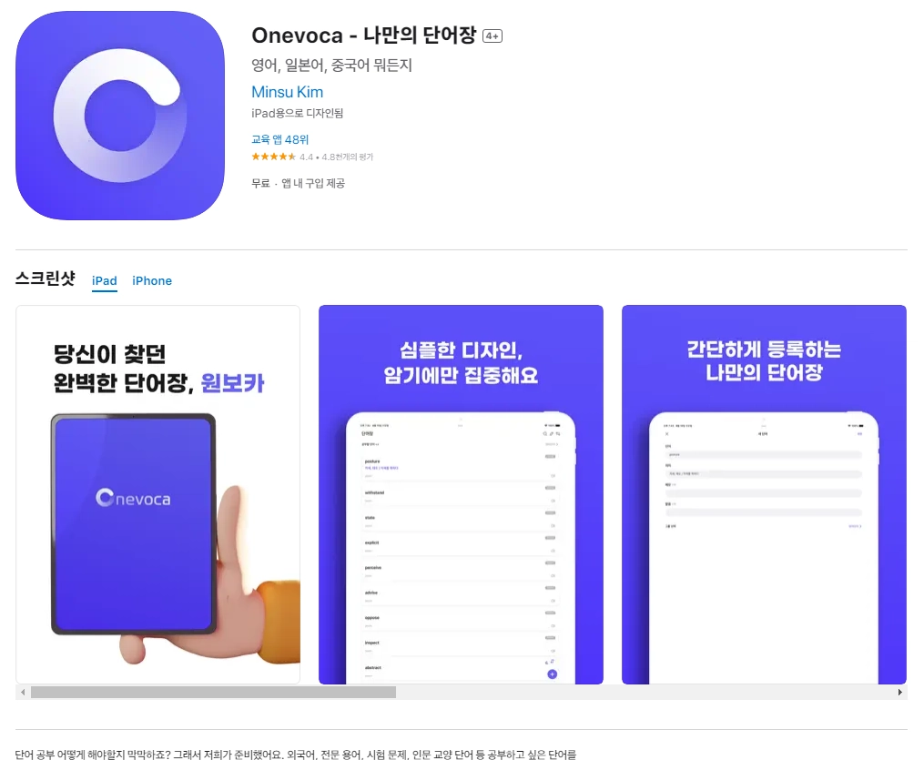 아래는 아이폰 Onevoca - 나만의 단어장 4+ 어플에 대한 자세한 설명입니다. 참고하세요.