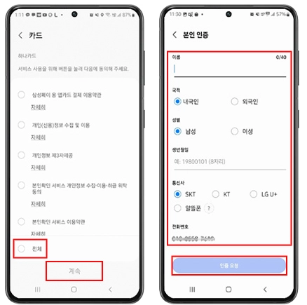 - 삼성 계정, 휴대폰 명의자(USIM 명의자), 예금주 동일