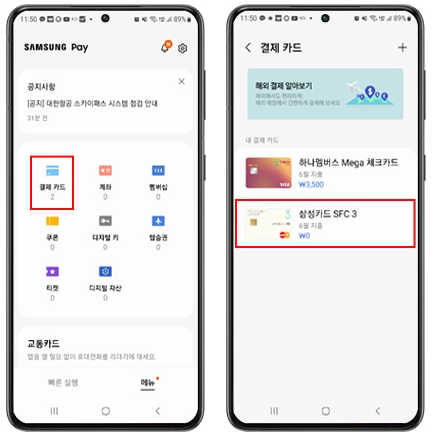 삼성페이 앱을 실행 시 최근에 결제 진행한 카드가 맨 앞에 나타납니다.